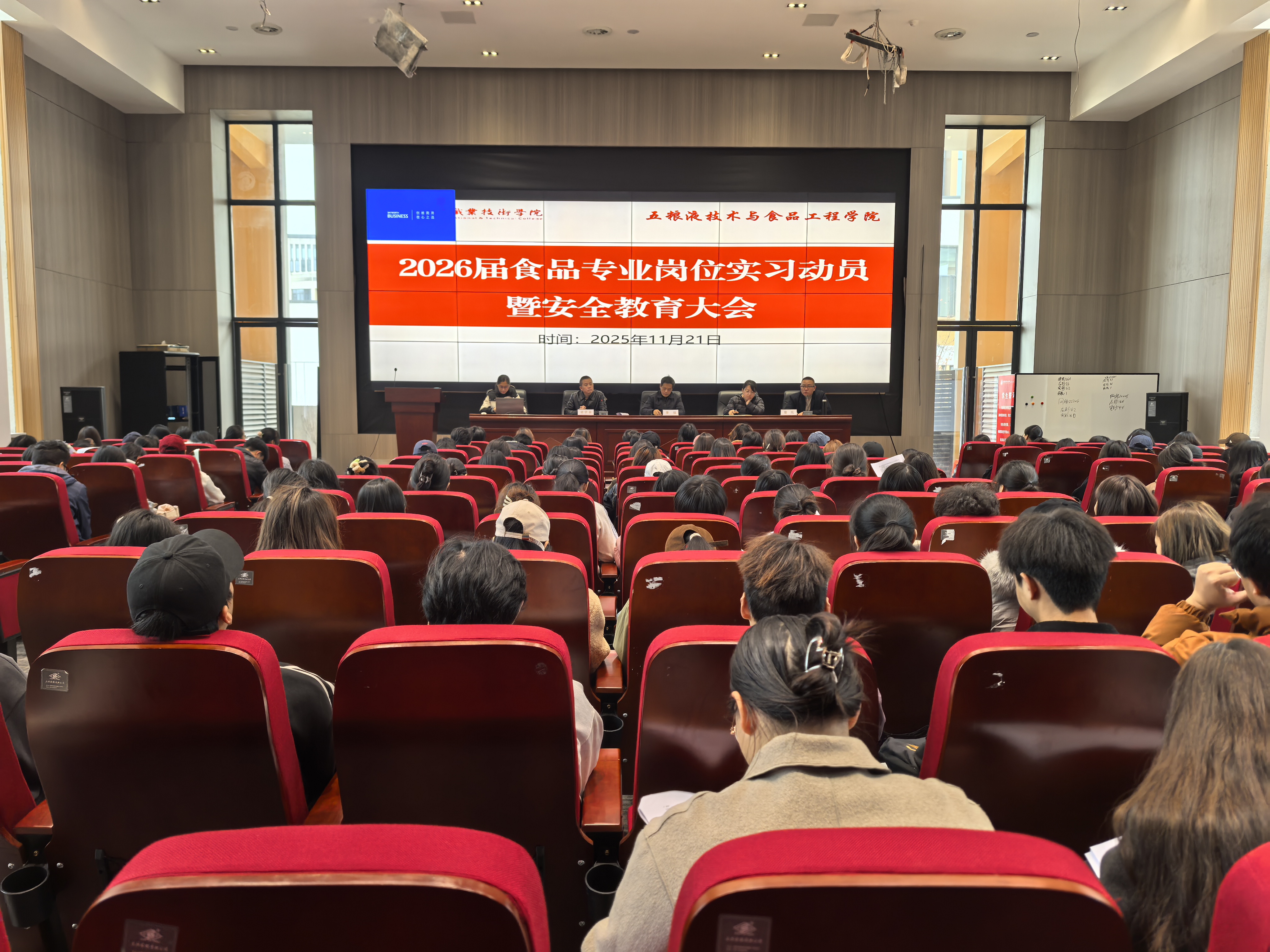 20251121日,我院在通达园201成功召开2026届食品专业岗位实习动员暨安全教育大会。学院党总支书记李强、院长曾欣、副院长梁宗余、食品生物教研室主任助理陈雪玲、食品检测教研室主任王琪,食品教研室全体教师及2026届食品专业全体毕业生出席大会现场。
