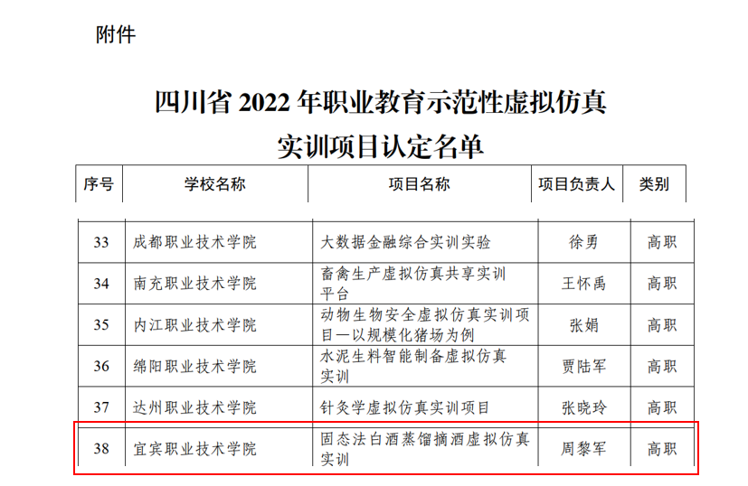 近日,从《四川省教育厅关于公布四川省2022年职业教育示范性虚拟仿真实训项目认定结果的通知》获悉,我院虚拟仿真实训项目《固态法白酒蒸馏摘酒虚拟仿真实训》成功认定四川省2022年职业教育示范性虚拟仿真实训项目。