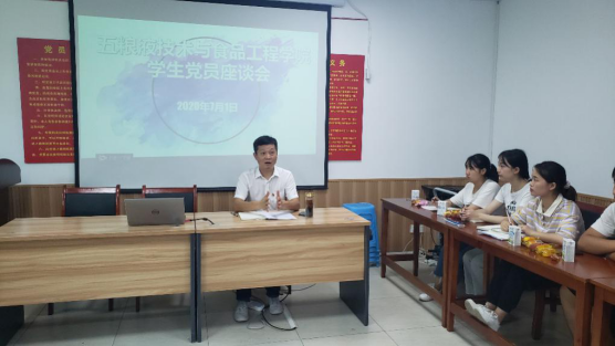 为庆祝中国共产党成立99周年,深化巩固“不忘初心、牢记使命”主题教育成果,回顾党的光辉历史,进一步加强学生党员队伍建设,2020年7月3日中午十二点四十至下午两点,五粮液技术与食品工程学院党总支组织全院18、19级学生预备党员和推优入党成员,在学院党群活动室开展了庆祝党的99年生日主题党日座谈会,本次座谈会由成洲书记主持。