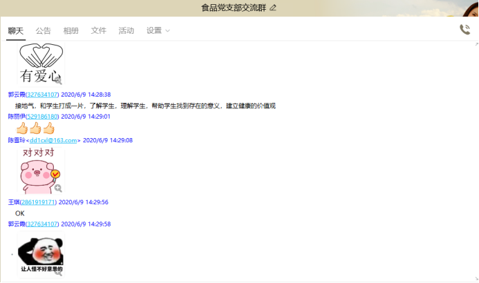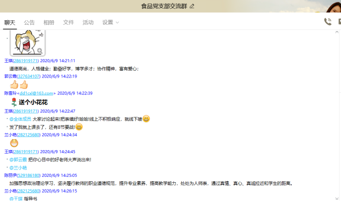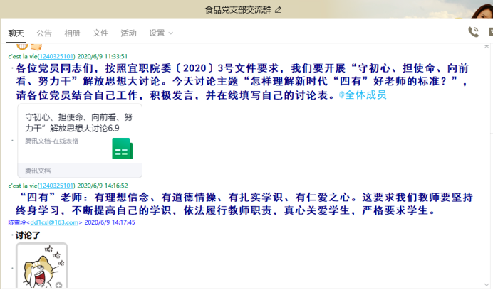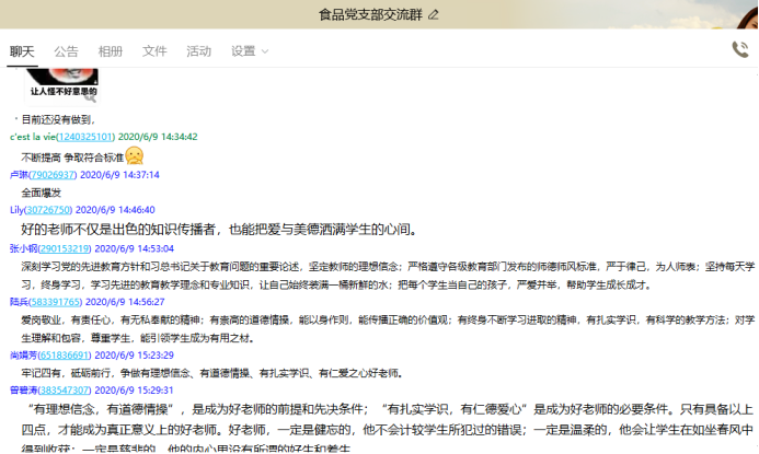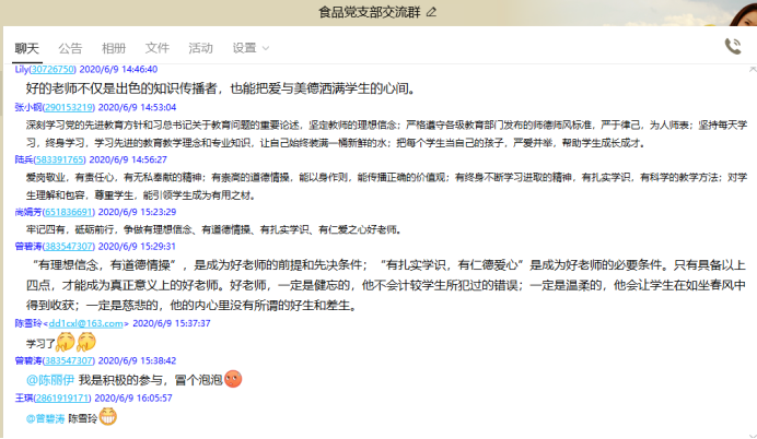为深入贯彻落实习近平总书记培养四有好老师重要讲话精神,促进教师队伍快步发展,69下午,五粮液技术与食品工程学院食品教研室党支部召开线上党支部会议,全体教师党员就“怎样理解新时代“四有”好老师的标准?”主题进行了讨论,食品教研室党支部罗鸣老师主持会议。