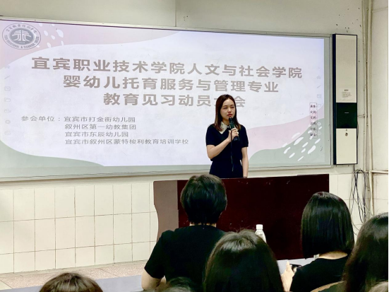 以行践知,知行合一,教育见习是教育教学职业能力培养的关键环节。为确保婴幼儿托育服务与管理专业教育见习工作的顺利开展,520日晚,人文与社会学院在第一教学楼1218教室召开婴幼儿托育服务与管理专业教育见习动员大会。人文与社会学院院长王岚,宜宾市打金街幼儿园、叙州区第一幼教集团、宜宾市东辰幼儿园、宜宾市叙州区蒙特梭利教育培训学校等四个参会单位的园企代表,婴幼儿托育服务与管理专业教师、辅导员以及婴幼儿托育服务与管理专业全体学生参加本次会议。