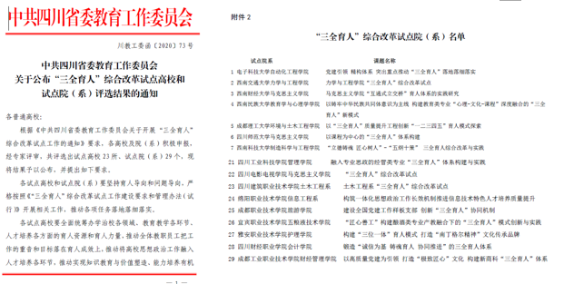 近日,中共四川省委教育工作委员会印发了《中共四川省委教育工作委员会关于公布“三全育人”综合改革试点高校和 试点院(系)评选结果的通知》(川教工委函〔202073号),五粮液技术与食品工程学院成为全省29个“三全育人”综合改革试点院(系)之一。