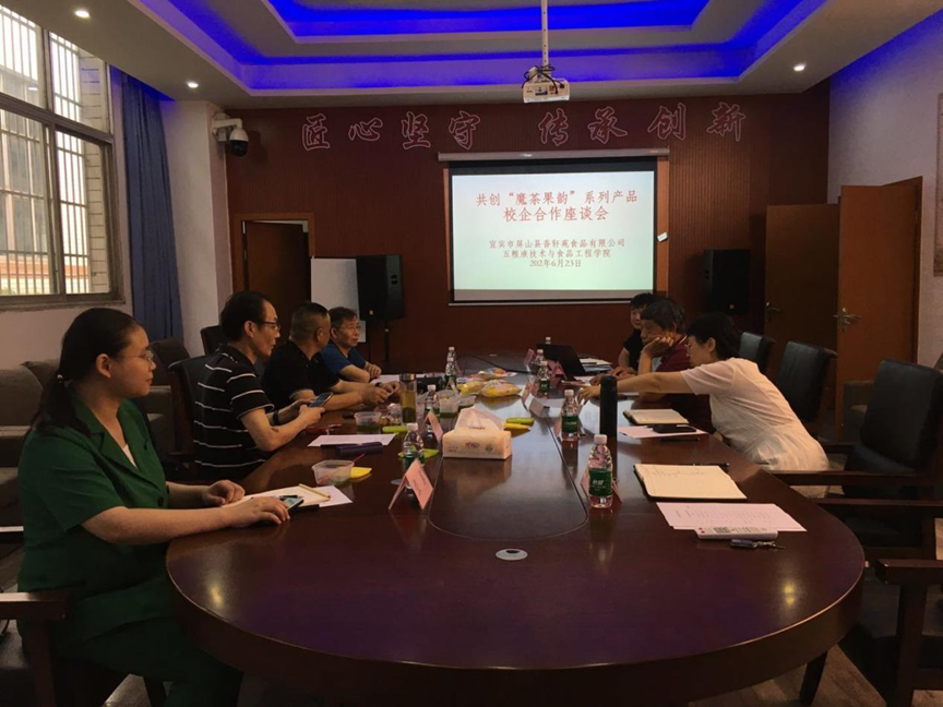 2022623日,宜宾市屏山县香轩苑食品有限公司总经理周明玉、党委书记魏亚林、产品经理廖永元、助理张露应邀来校座谈。宜宾职业技术学院副院长周黎军、五粮液技术与食品工程学院院长卢琳及部分专业教师参与座谈。