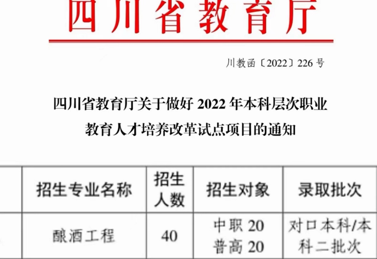 20225月,根据《四川省教育厅关于做好2022年本科层次职业教育人才培养改革试点项目的通知》(川教函〔2022226号)精神,经学校申报、教育厅审核,决定由省内17所本科学校、19所高职学校与合作企业(单位)联合开展2022年本科层次职业教育人才培养改革试点工作。其中,我院“酿酒工程”专业被纳入“2022年本科层次职业教育人才培养改革试点项目”。