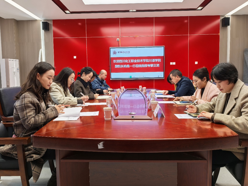 20241128日上午,四川化工职业技术学院川酒学院副院长哈霞率队来宜宾职业技术学院五粮液技术与食品工程学院学习交流。我院副院长梁宗余,教研室主任、教学科长等参加考察交流。
