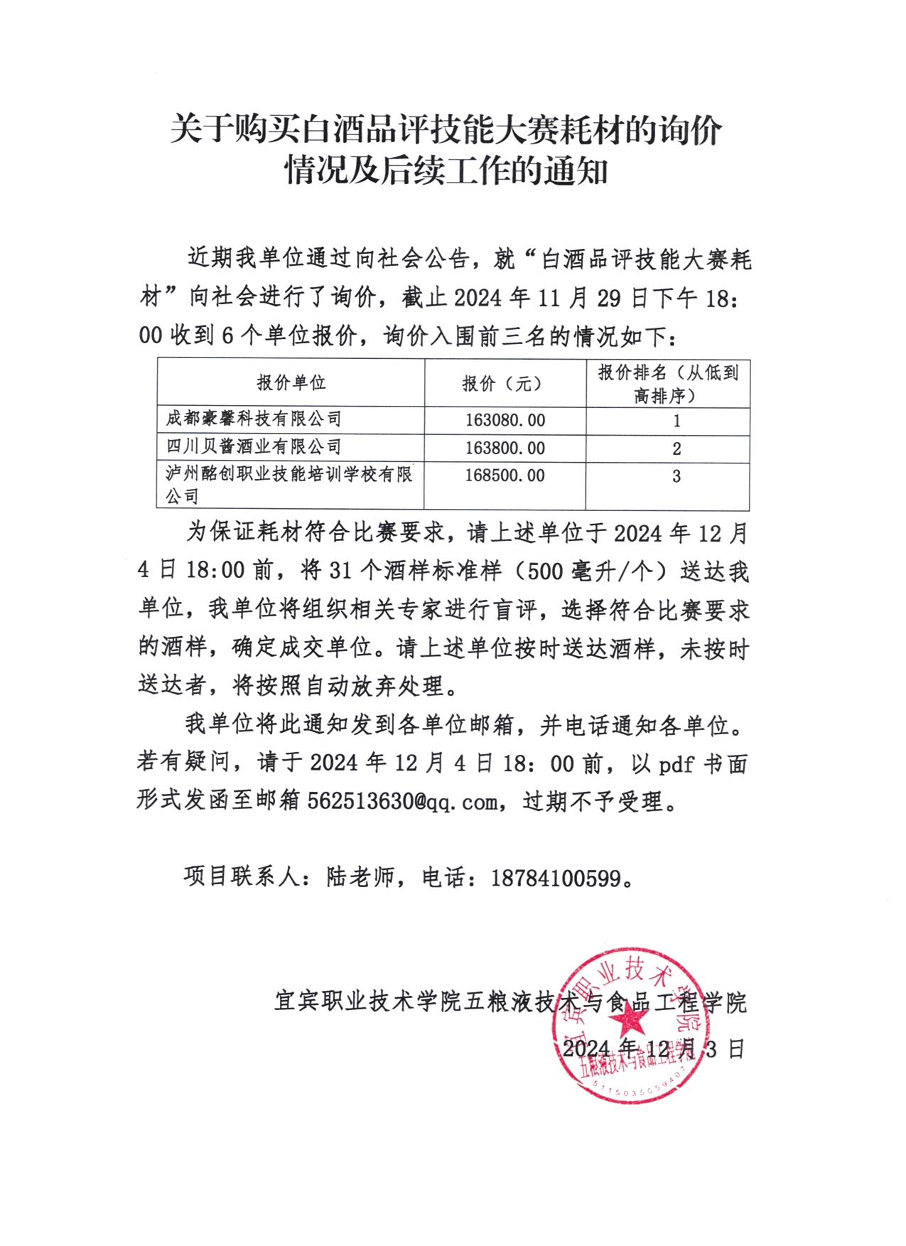 关于购买白酒品评技能大赛耗材的询价情况及后续工作的通知