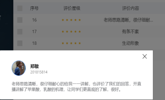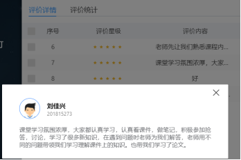 当日线上学习结束后,学生可以主动去完成学生总结和学生评价,让老师及时了解学生课堂的学习成效及学习反馈,有效地帮助老师了解学生课堂的学习状况和课堂授课方式学生是否能有效地接受,让老师及时发现自身问题。通过学生评价反馈网上授课课堂学习氛围浓厚,同学们可以认真学习,认真看课件,做笔记,并且可以积极参加抢答、讨论,在本次课程中也学习到了很多新知识,在遇到问题时老师可以及时为我们解答,老师用不同的问题带领我们学习理解课件上的知识。通过给学生进行论文的讲解,达到理论和实际相结合的目的,使知识更条理化,与学生积极互动,带动了大家学习兴趣。