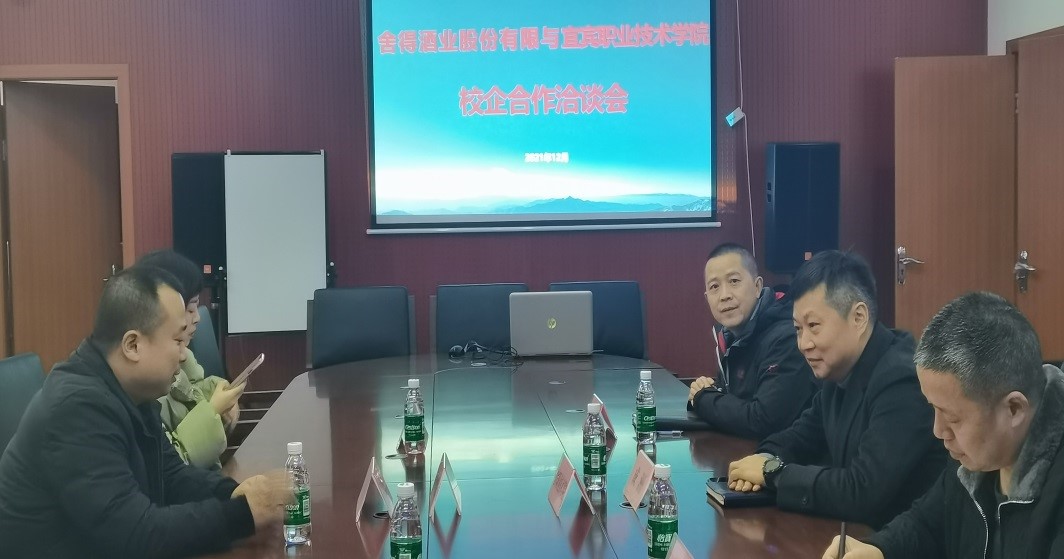 2021年12月16日,舍得酒业股份有限公司闫德民副总经理带队来到宜宾职业技术学院五粮液技术与食品工程学院洽谈校企合作事宜,随行有舍得酒业股份有限公司人力资源部经理刘莹、舍得酒业股份有限公司培训部经理毛雨。参与洽谈的有五粮液技术与食品工程学院党总支书记成洲,副院长梁宗余、酿酒技术专业主任辜义洪。
