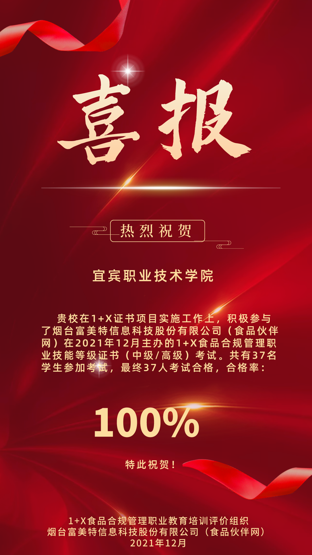 喜报:我院食品生物技术与食品检验检测技术专业37位学生于2021年12月5日参加教育部1+X食品合规管理职业技能等级(中级)证书考核,37名学生考核成绩均达70分以上,通过率100%。