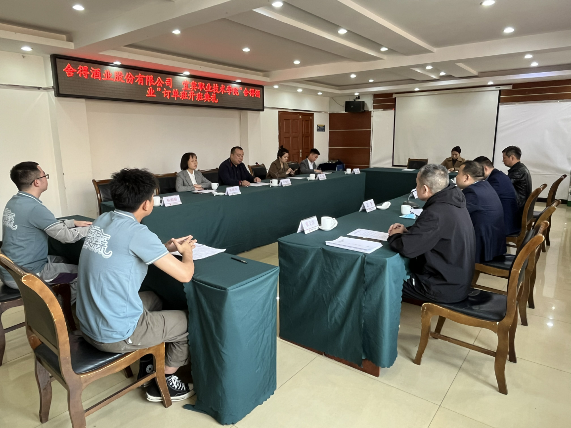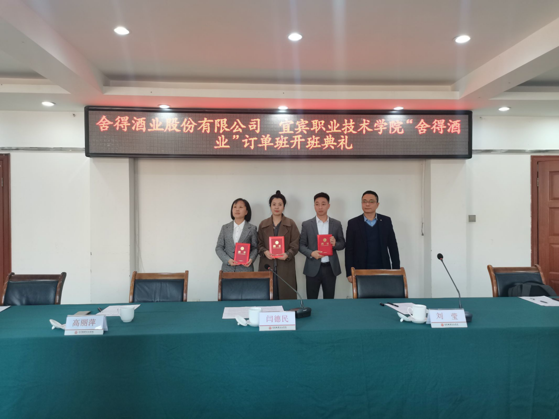 1115日,宜宾职业技术学院五粮液技术与食品工程学院携手舍得酒业股份有限公司在学校科苑宾馆三楼会议室举办“舍得酒业”订单班开班典礼。舍得酒业人力资源中心副总经理闫德民,招聘经理刘莹,培训经理高丽萍、胡鑫,学校党委常委、副院长王志刚,党委委员、教学管理与质量处处长兼五粮液技术与食品工程学院院长王赛,党委委员、五粮液技术与食品工程学院党总支书记成洲,酿酒技术专业主任辜义洪,专业教师代表及舍得订单班全体学生参加了本次开班典礼。会议由教学管理与质量处处长兼五粮液技术与食品工程学院院长王赛主持。